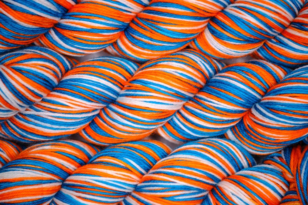This hand-dyed self-striping sock yarn is made of 85% merino wool and 15% nylon.