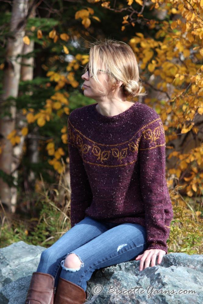 Fallen Leaves is a relaxed Circular yoke sweater knit from the top down featuring a leaf motif. This is an original design by Andrea Yetman inspired by that time in Fall just before the leaves have fallen from the trees when the colors are at their utmost beauty.