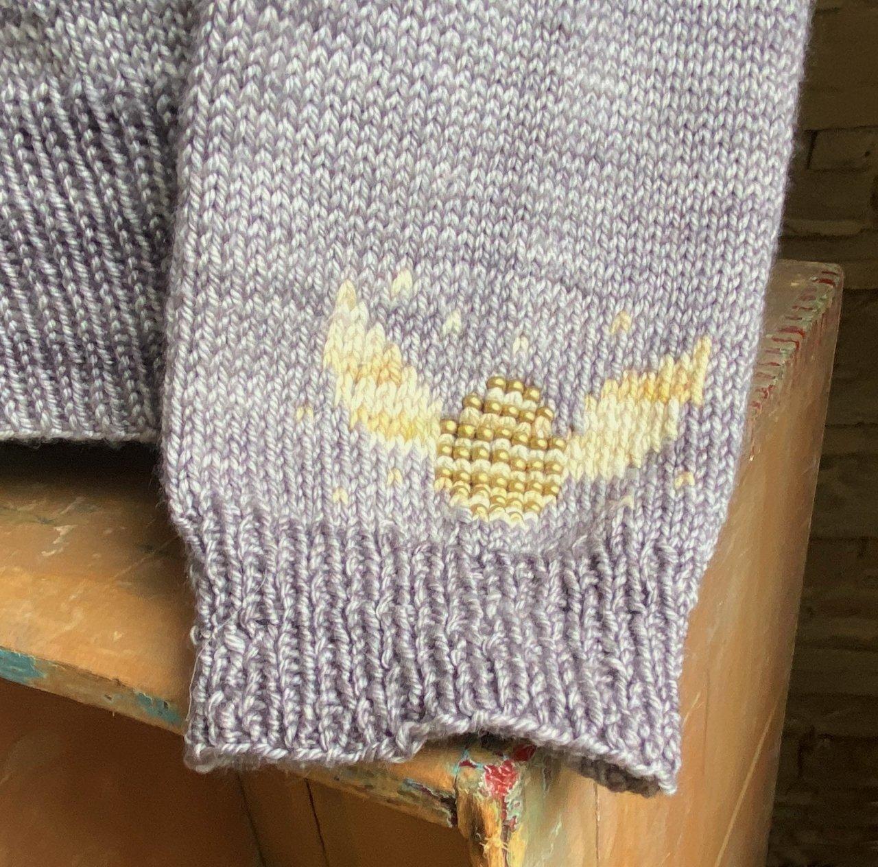 This yoke is worked from the top down with a positive ease of about 2-4 inches; 5-10 cm. You can adjust the length of the body and sleeves if needed, but keep in mind to adjust the yardage required as well. The yoke is featuring a stranded colorwork pattern where the center of the golden snitch is beaded. Another Golden snitch is also added on the right sleeve.