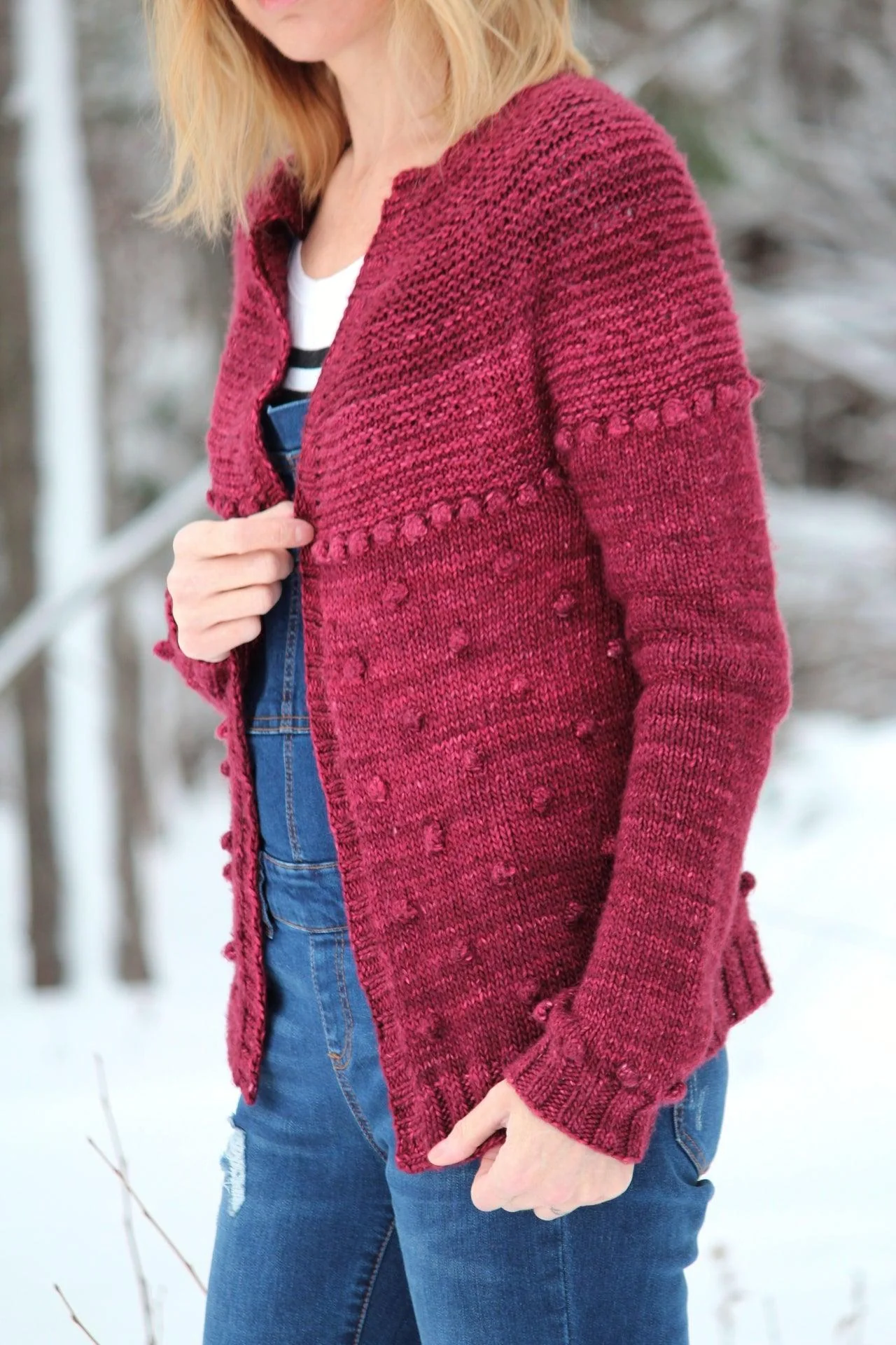 The Sadie cardigan is knit seamlessly in a circular yoke from the top, with stitches picked up and knit in a 2x2 rib for the collar and front bands at the end. This cardigan is meant to be worn with 1 to 2 inches of positive ease. For a tutorial on how to make the Bobble Stitch, click HERE.